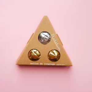 Chaque balle en polyester or ou argent mesure 7 cm de diamètre pour convenir aux petit comme aux grands. Le set de balles de jonglage arrive dans un joli coffret triangulaire en carton brut, parfait pour offrir.