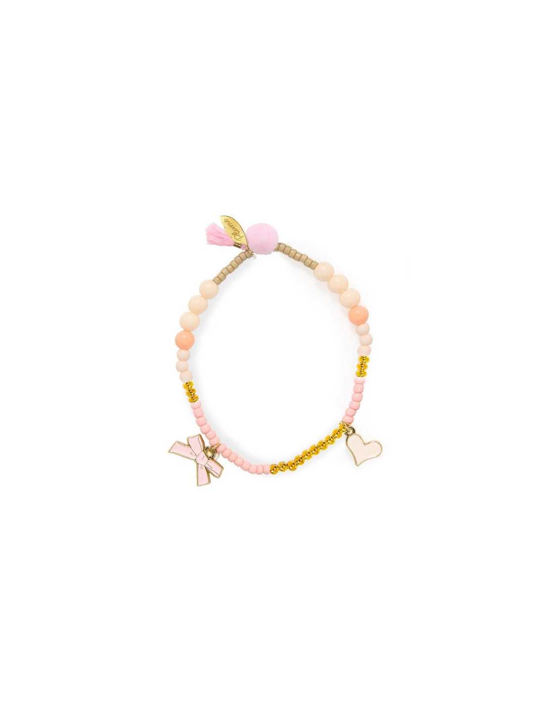 Plongez dans l’univers gracieux de la danse avec ce bracelet orné de perles en acrylique, de deux charms en métal émaillé représentant un ruban et un cœur, ainsi que d’un pompon en polyester et d’un pompon gland en coton. Il apporte une touche délicate et poétique à votre poignet. Son double fil élastique assure une solidité optimale tout en garantissant un enfilage facile, sans fermoir.