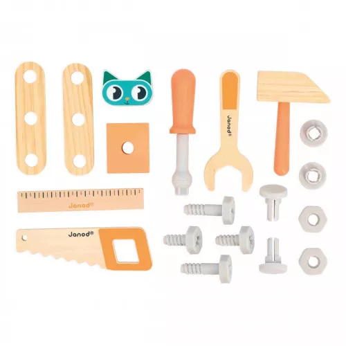 Ce camion est équipé de nombreux accessoires et outils(tournevis, clé, scie, règle et marteau, quatre pièces en bois et 10 accessoires de visserie en plastique), et sera aussi un véritable jeu de construction entre deux promenades.