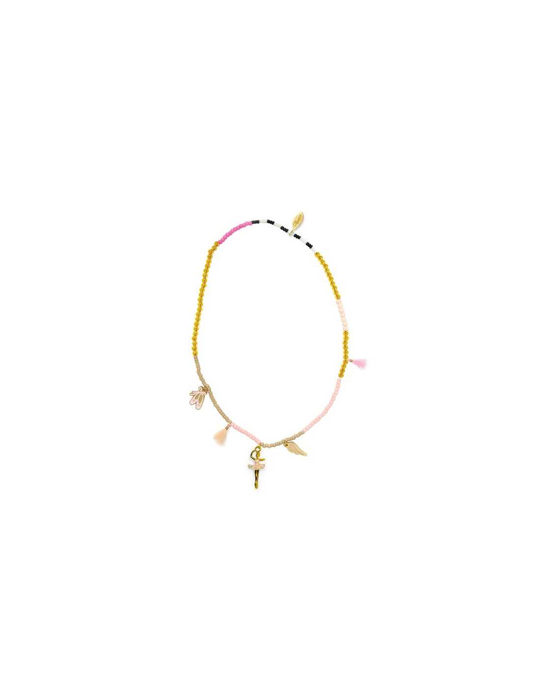 Plongez dans l’univers gracieux de la danse avec ce collier composé de perles en acrylique et de cinq ornements délicats : trois charms en métal émaillé représentant une ballerine, une aile et une chaussure de ballerine, ainsi que deux pompons gland en coton. Ce collier allie élégance et légèreté. Son double fil élastique assure une solidité optimale tout en garantissant un enfilage facile, sans fermoir