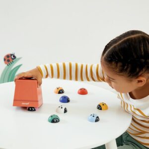 - Contenu : 8 coccinelles, 16 pions de 8 couleurs différentes, 1 pot de fleur, 2 buissons, 10 feuilles récompenses, 1 sac de rangement en coton et 1 notice.