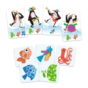 Découvrez ce jeu de stratégie simple pour les enfants dès 4 ans, dont les illustrations amusantes plairont aux petits comme aux grands ! Le but : être le premier à constituer son groupe de 4 pingouins musiciens.