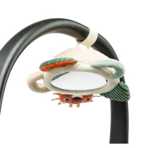 Lorsqu’il est allongé sur le ventre, bébé s’amuse à observer son reflet dans le miroir, une activité idéale pour favoriser la découverte de soi et le développement visuel. Tout autour, de petites activités sensorielles en tissu invitent à toucher, manipuler et explorer différentes textures.