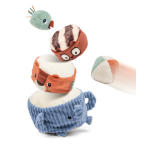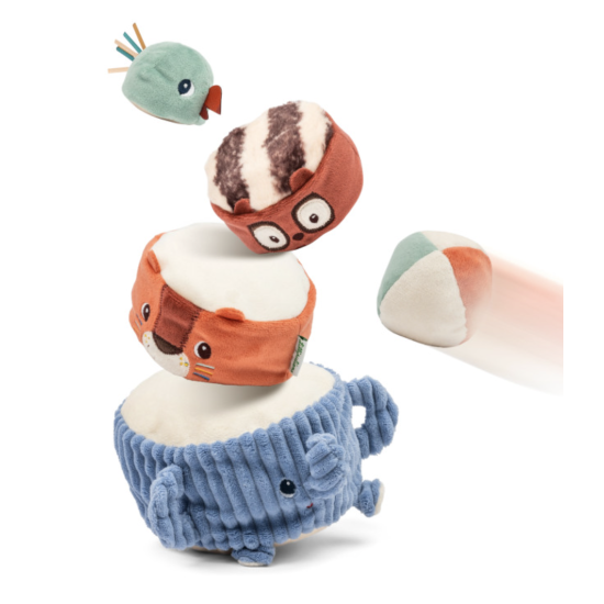 Et lorsque la pyramide est enfin construite, place au défi ! Bébé peut lancer la balle en tissu incluse pour faire tomber la tour et la voir s’écrouler dans un éclat de rires. Un jeu plein de surprises qui invite à recommencer encore et encore.