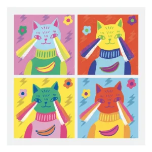 Sarah Walsh s’inspire du travail de l’artiste Andy Warhol et propose de compléter 4 tableaux grâce aux autocollants fournis. Petit à petit, les portraits prennent vie…