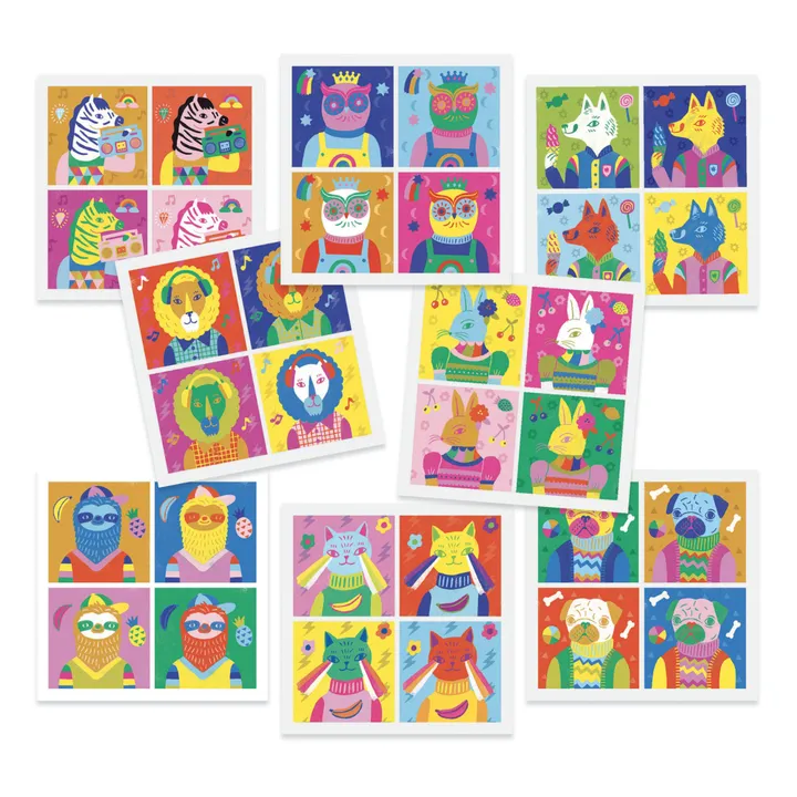 - 8 tableaux à réaliser (20 x 20 cm), 8 planches de stickers et 1 livret explicatif pas à pas en couleurs