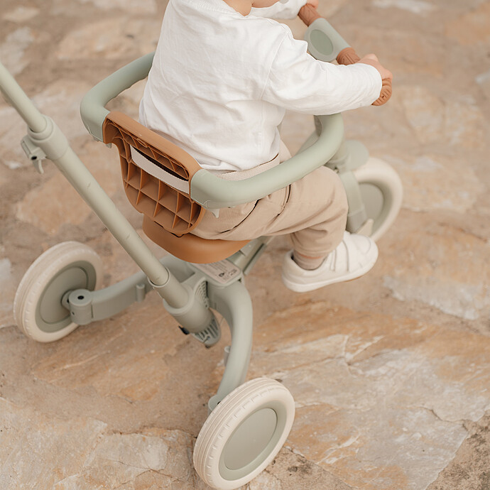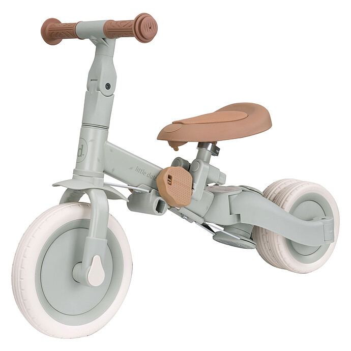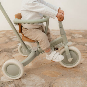 Vous l’utiliserez tout d’abord comme tricycle avec sa barre de poussée (réglable en hauteur) et son arceau de sécurité. Ensuite, vous pourrez les ôter pour obtenir un tricycle-draisienne. Les roues arrières du tricycle pourront être repliées vers l’intérieur permettant ainsi de l’utiliser comme vélo à pédales. Enfin, ces pédales se monteront et se démonteront facilement et pourront même être rangées sous la selle afin d’obtenir un super vélo d’équilibre !